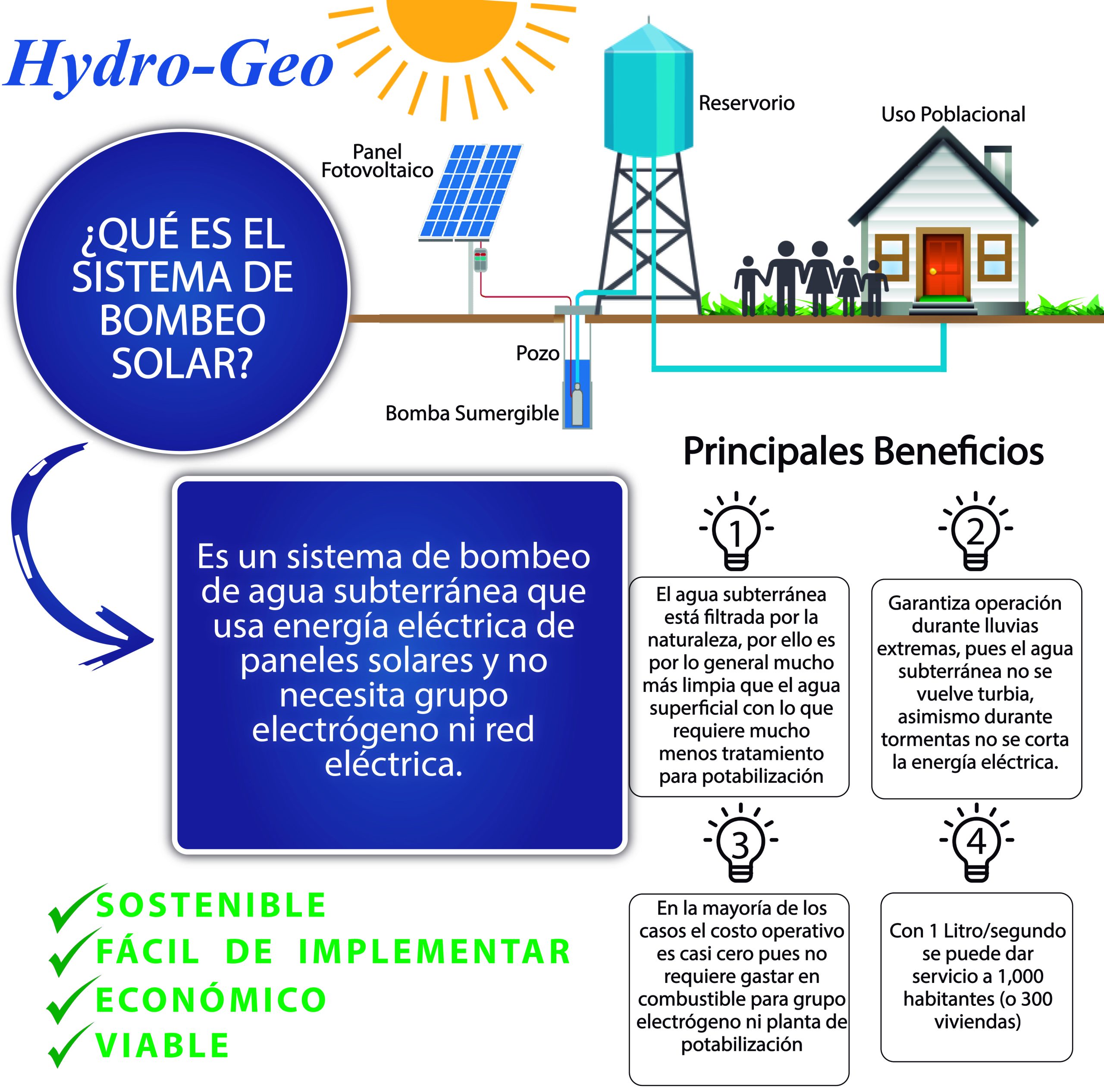 Hydro-Geo pone al conocimiento el servicio sostenible «Bombeo Solar», el cual tiene como objetivo principal brindar agua limpia y saneamiento a bajo costo operacional a poblaciones rurales.